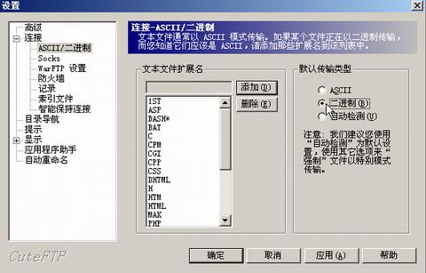 1.如果您采用的是Cuteftp來上傳系統(tǒng),請參照下圖進(jìn)行設(shè)置:編輯-設(shè)置-傳輸類型-二進(jìn)制,如圖所示: