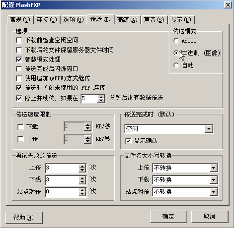 2.如果你采用的是Flashfxp來上傳系統(tǒng),請參照下圖進(jìn)行設(shè)置:選項(xiàng)-參數(shù)設(shè)置-傳送-二進(jìn)制 如圖所示